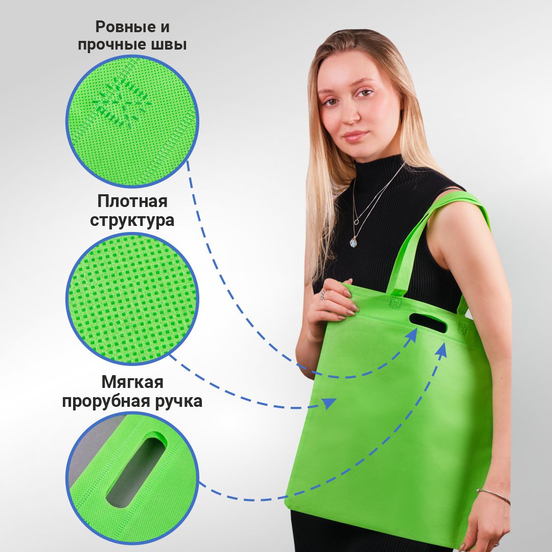 Многоразовый шоппер из нетканого материала с надежными пришивными ручками. Сумка из спанбонда приятная на ощупь, легкая и компактная.