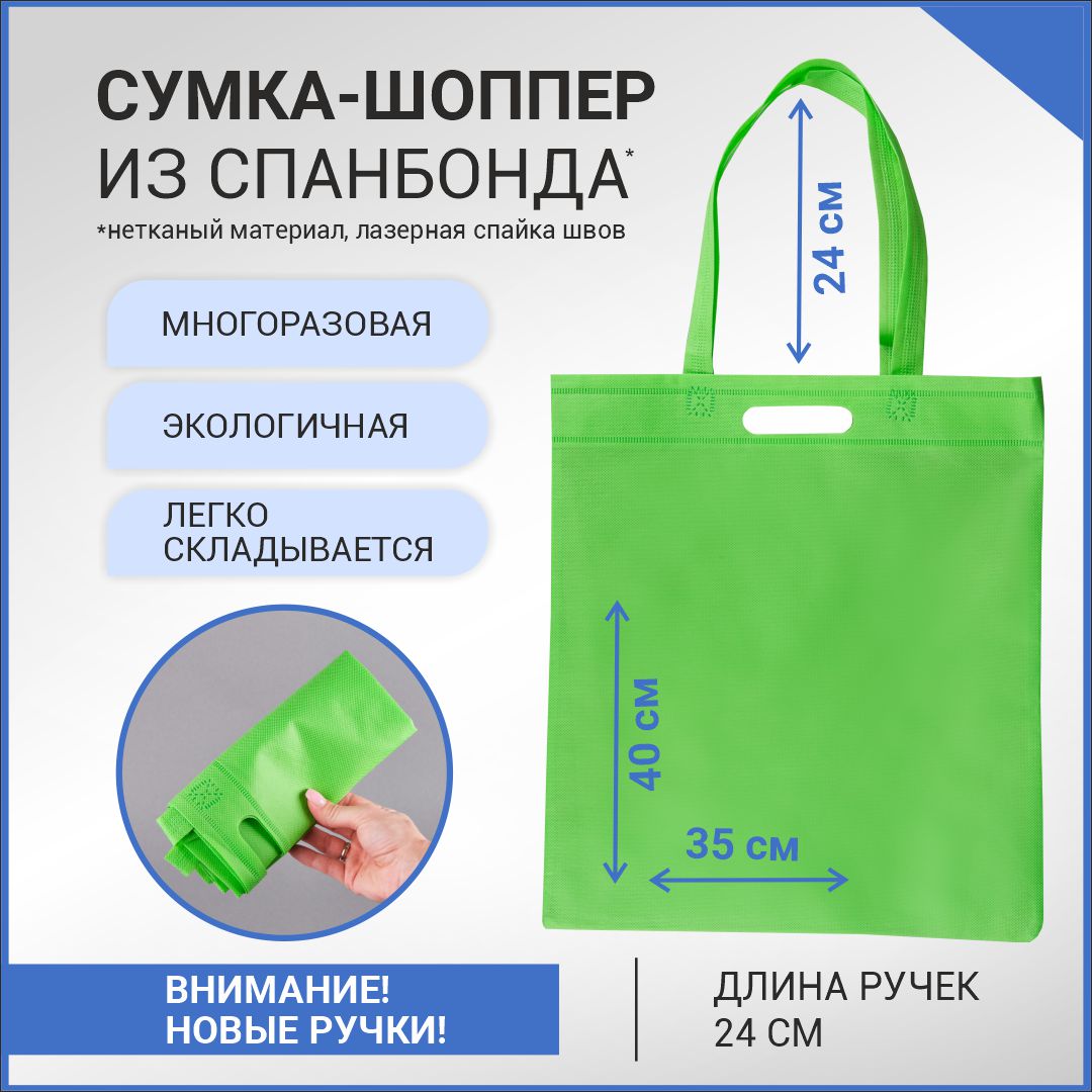 —Сумка-шоппер из спанбонда с пришивными ручками 24 см, зеленая, 35 х 40 см